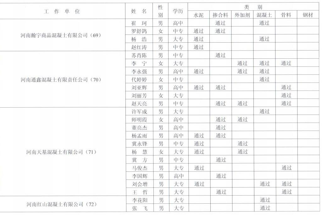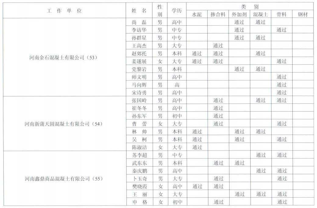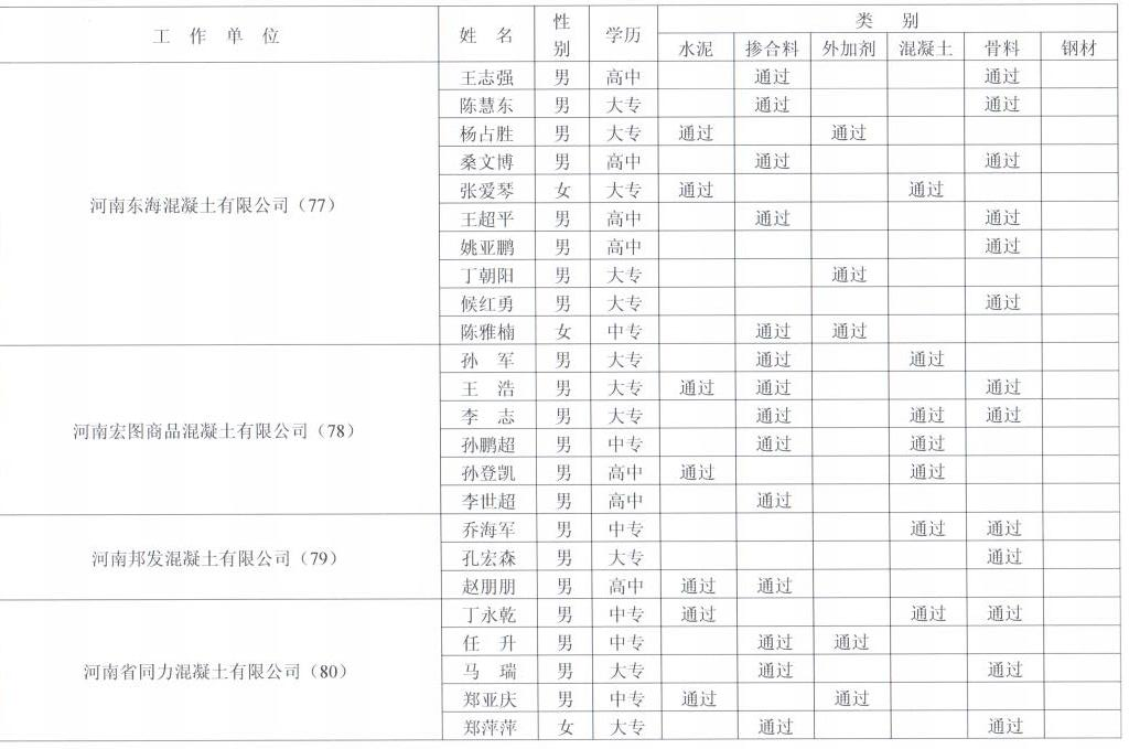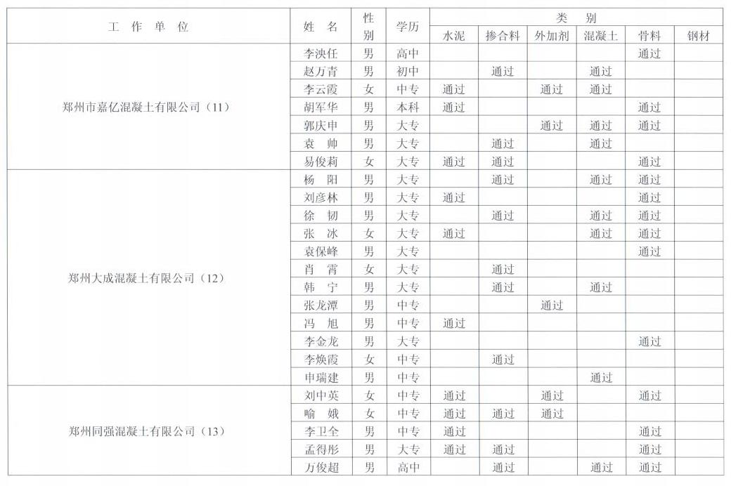 郑州市预拌商品混凝土试验室试验员能力考核通过名单